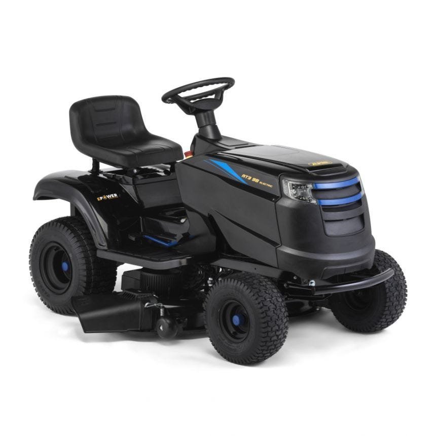 Ein elektrischer Gartentraktor mit 48-V-Lithium-Ionen-Akku und Seitenauswurf und einer Schnittbreite von 98 cm. Ideal für Grundstücke ab ca. 3500 m².